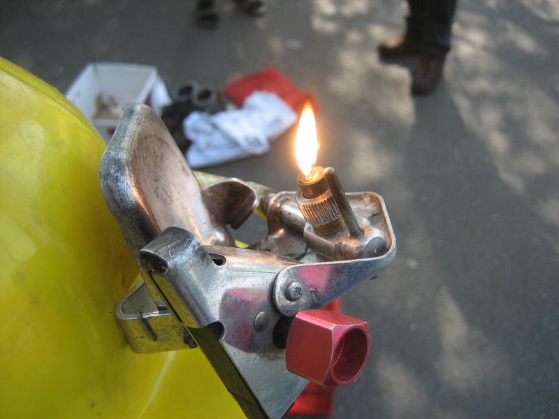 Karbid und Wasser aufgefuellt, Zuendung, funzt.